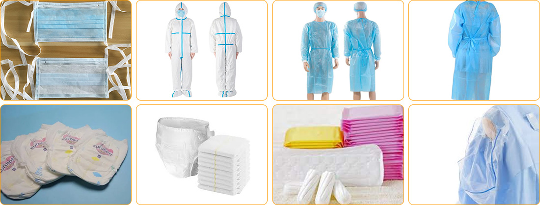 Медицина и здравоохранение:Операционная одежда, простыни, операционные шапочки, защитная одежда, дезинфекционные пакеты, маски, подгузники, женские гигиенические салфетки, детские подгузники, брюки для взрослых, мочеприемники для домашних животных, нетканые материалы для подгузников для домашних животных, ткань-основа для лицевой маски